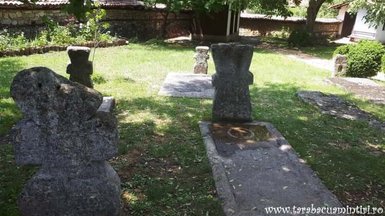 Aleea străbate curtea până în fața bisericii. Aici, tăcute și modeste, câteva cruci de piatră îmbogățesc aura spirituală a locului.