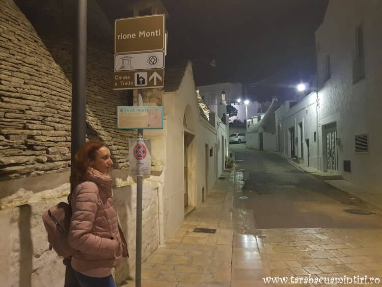 Am ajuns în orașul caselor trulli atunci când soarele dădea semne de oboseală. Lumina care se revărsa peste acoperișurile conice crea un adevărat spectacol vizual, un joc de umbre și culori mângâiate tandru de raze tremurânde. Nu mă mai săturam de ceea ce vedeam și de făcut fotografii. Pentru a ajunge la casa în care am fost cazată am străbătut partea mai animată a orașului, Rione Monti.