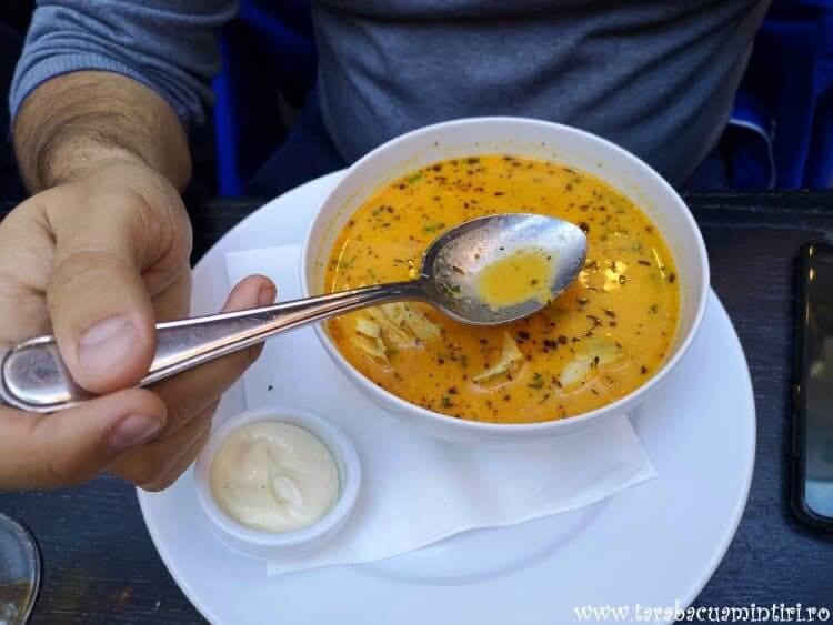 Mi-a fost destul de greu să mă decid unde să mă așez și ce să mânânc. Totuși, peștele este vedeta acestei zone, așa că am mers pe această variantă. Supa de pește a fost demențială iar lupul de mare pe pat de cartofi cu roșii coapte, fenicul și ierburi aromatice a fost de nota 10 plus.
