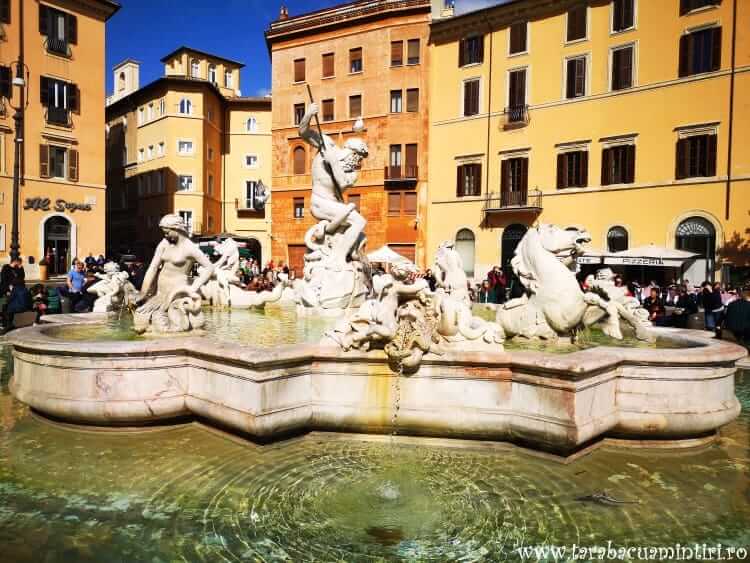 Piazza Navona, una dintre cele mai frumoase piețe din Roma, a fost construită la sfârșitul sec. al XV-lea pe ruinele vechiului stadion al lui Domițian. Astăzi, piața oferă celor ajunși aici nu mai puțin de trei fântâni, fiecare având povestea și farmecul său. Acestea sunt Fântâna celor Patru Fluvii, înfățișând Dunărea, Gangele, Nilul și Rio de la Plata, Fântâna lui Neptun și Fântâna Maurului. Pe lângă imaginea acestor fântâni transformate în adevărate capodopere arhitecturale, piața este străjuită de fațada tulburătoare a bisericii Santꞌ Agnese in Agone.
